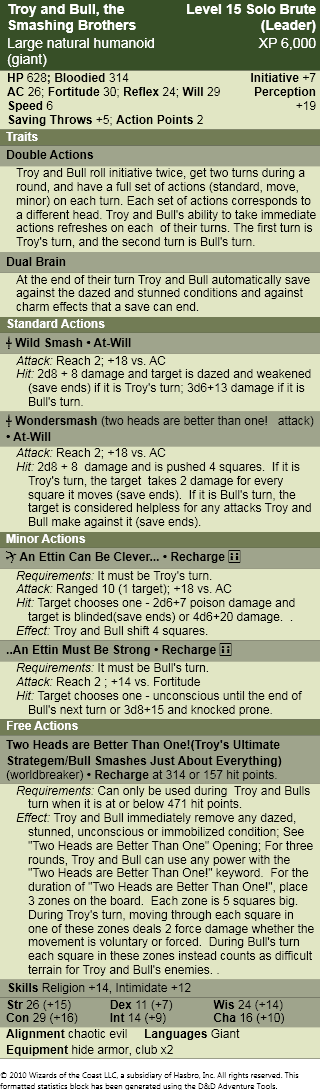 Big Oafs (DC 23): One is smart, the other is strong. They are both incredibly slow. You exploit this fact and stay one step ahead. Skills: Stealth, Bluff, Acrobatics. Success: If Troy or Bull miss you with an attack, you gain combat advantage against them until the end of your next turn.