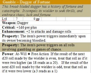 Before I end, I should probably address the save-or-die curses. Some are fairly simple to import, like the Necklace of Strangulation. In 2nd edition this item dealt 6 points of damage per round to its wearer until their corpse fully decomposes, removable only with a wish or miracle! For 4E, you would probably want to give three saves, assisted by Heal checks, to prevent death so that it works more like a petrifying gaze attack. Don’t put these in every treaure chest, but once or twice per Tier, something similar could be quite a fun surprise! The scarab of death which after being worn for at least 10 minutes suddenly insta-kills … not so much. It’s just not the right fit for the heroic genre. Leave it be.
