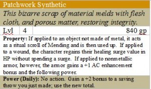 I came upon one solution to this problem several weeks back, something I call Compound Items. Here’s something one Power Source Campaign party found in the belongings of what amounted to a flesh golem – it’s called Patchwork Synthetic.