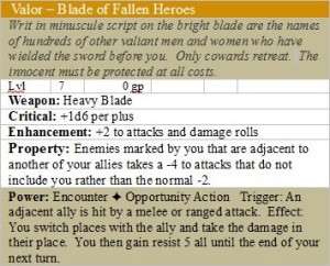 If, however you are the sort of sadistic DM that needs to inflict horrible punishments and crippling infirmities on your PCs just because you can (and for whatever reason you’re still playing 4E), then let your players be heroic in their suckiness. That is, let them choose to be cursed, take up the weapon that can’t be sheathed or wear the ring that can’t be removed. But who’s going to choose being cursed? I bet the paladin in your party would rather be unable to put down the immensely powerful but soul-draining cursed sword rather than let it fall into the hands of the villain. I bet the party psion already hears enough voices in her head that she could deal with a supernatural possession better than that 10-year old orphan over there. And I bet the party rogue is willing to be mute or take a -4 to all saving throws if it will help him get through the dungeon to the hoard of gold at the end. You can hand your PCs the 2nd edition Backbiter Spear in 4th edition so long as they know how it works in advance and it will be an interesting, compelling item when used. A good DM will know the characters’ (and players’) motivations and can use them to convince said characters to willingly take on horrifying curses.